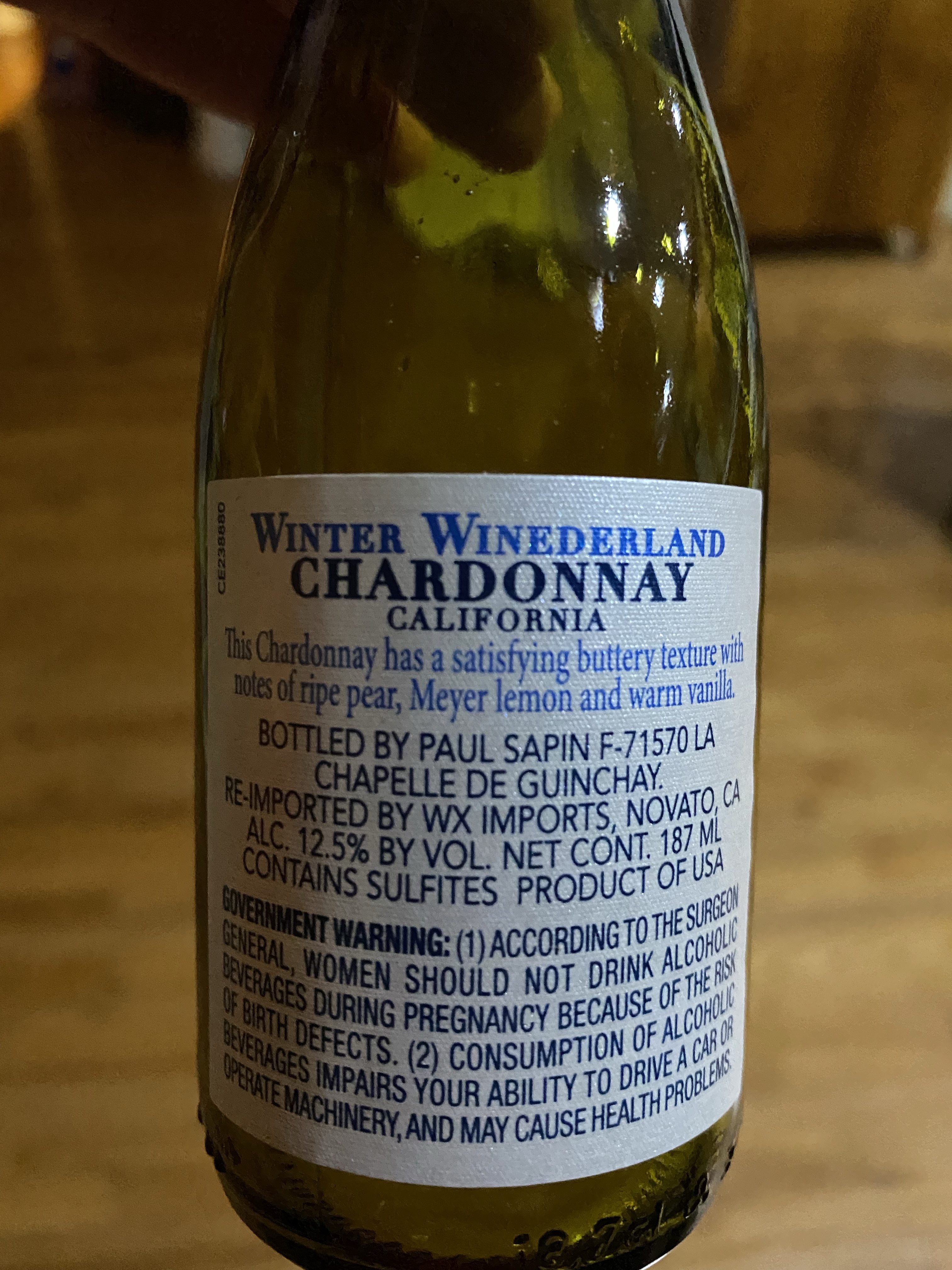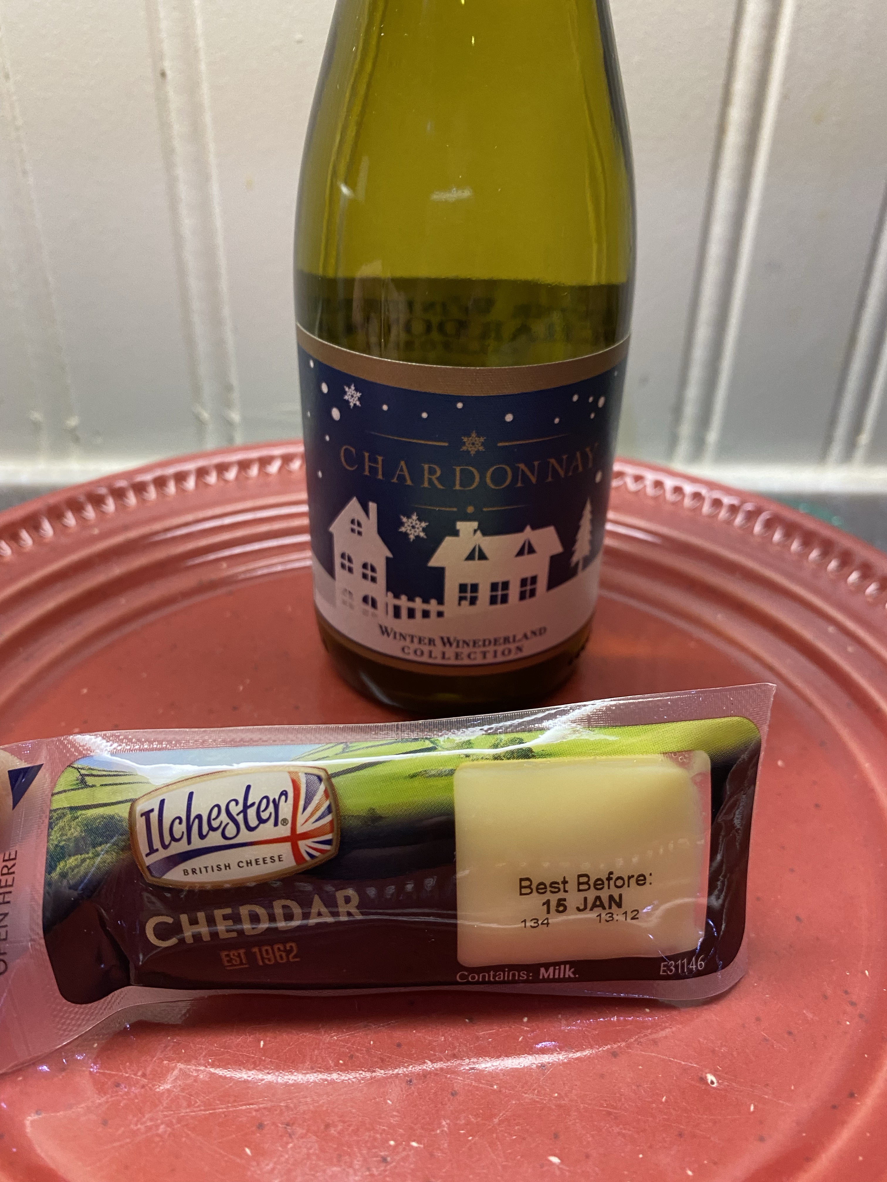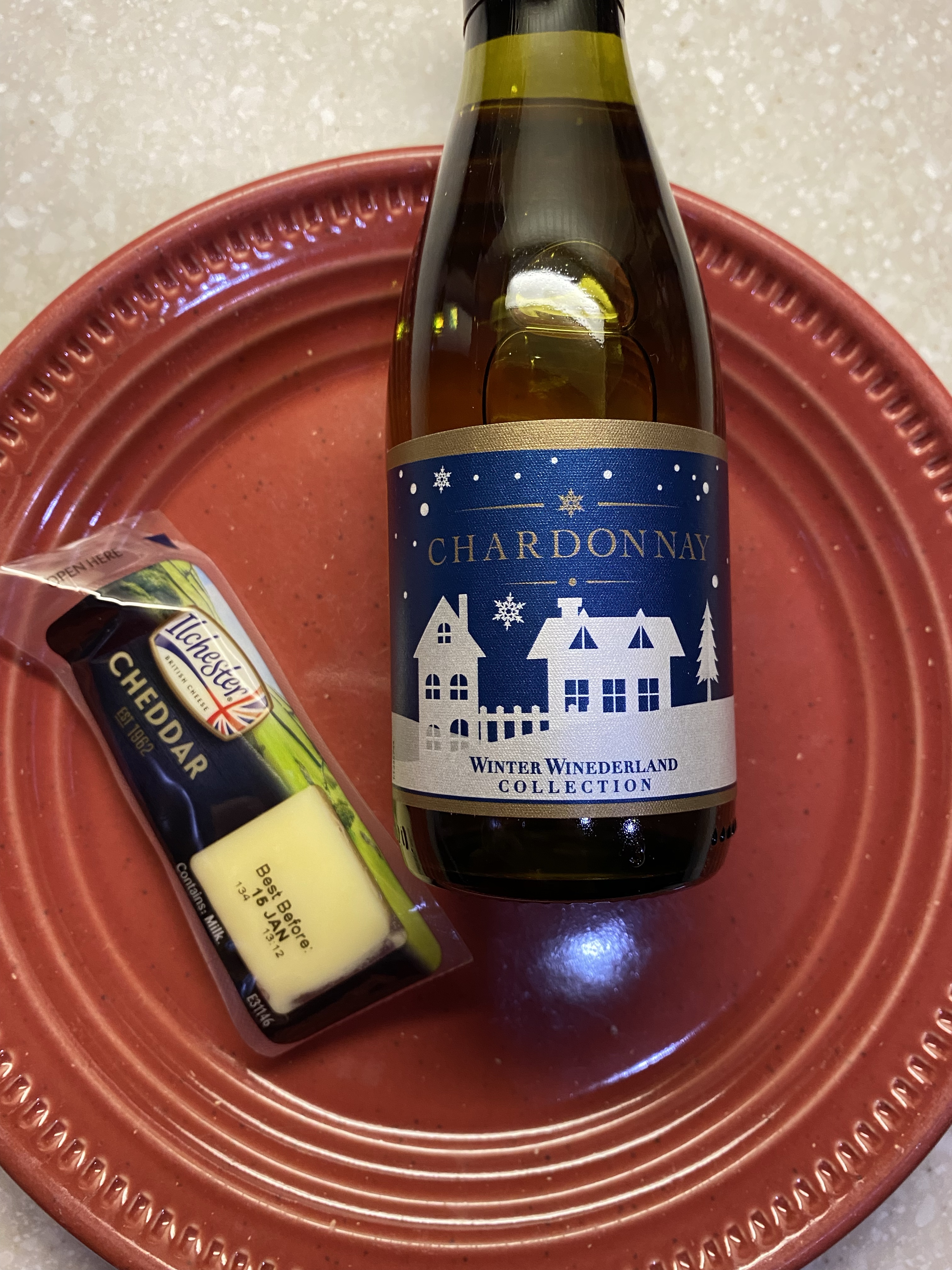 Tonight’s pairing was a mini bottle of Chardonnay (equal to one large glass or two small ones for sharing) and a lovely English sharp cheddar. I would really like to know more about this wine and the cheese because both were terrific and fabulous together! The wine was just as the mini label stated, buttery, pear, Meyer lemon and vanilla.