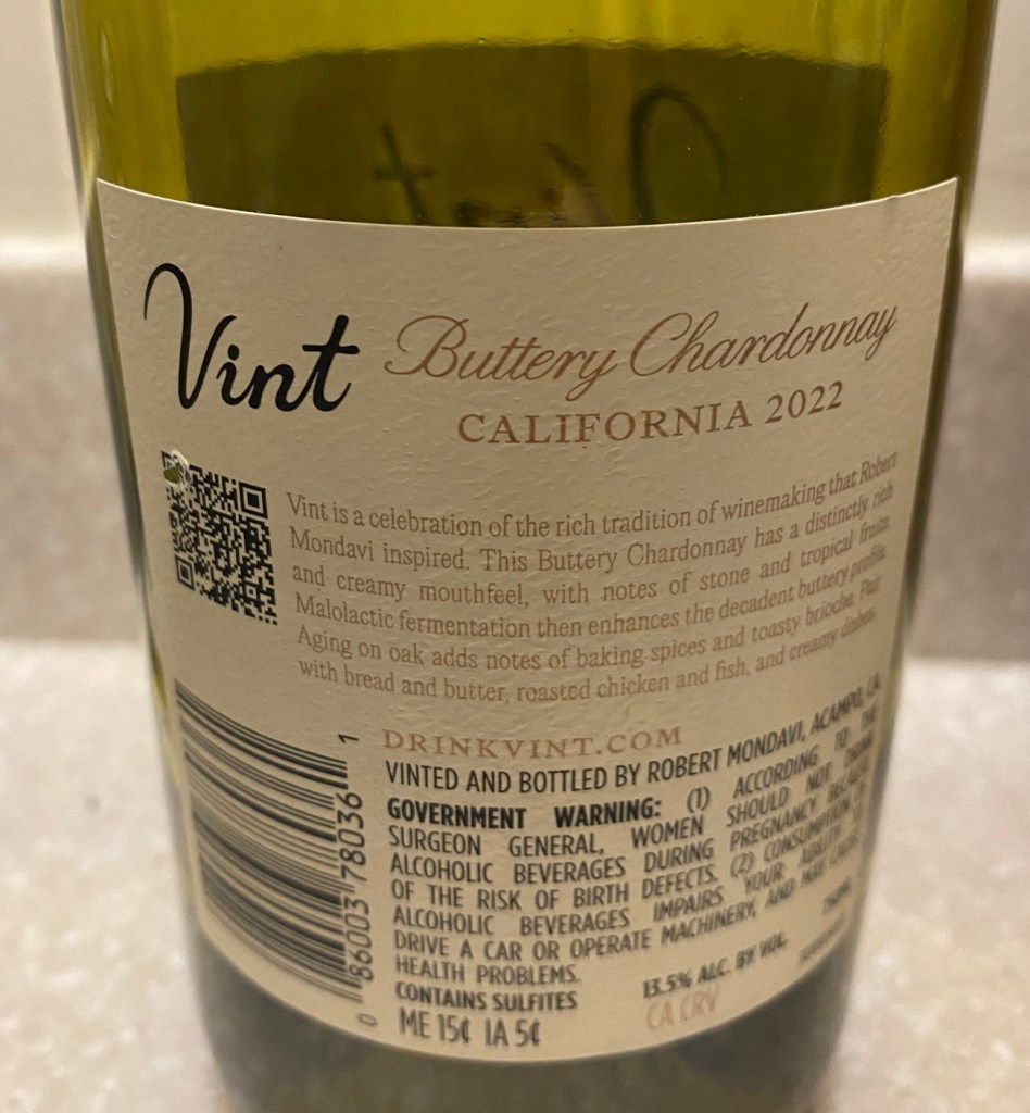 It’s called Vint, Private Selection 2022, Buttery Chardonnay, by renowned winemaker, Robert Mondavi.